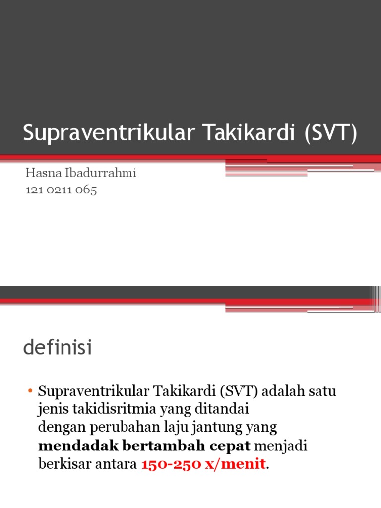 Supraventrikel takikardi svt adalah suatu keadaan dimana jantung mengalami detak jantung yang lebih cepat dan teratur yang mana detak atau denyut jantungnya berkisar 150 250 denyut permenit. Definisi supraventricular tachycardia svt. Supraventricular tachycardia svt adalah kondisi di mana jantung berdetak terlalu cepat. Kondisi ini juga bisa disebut sebagai takikardia supraventrikular.